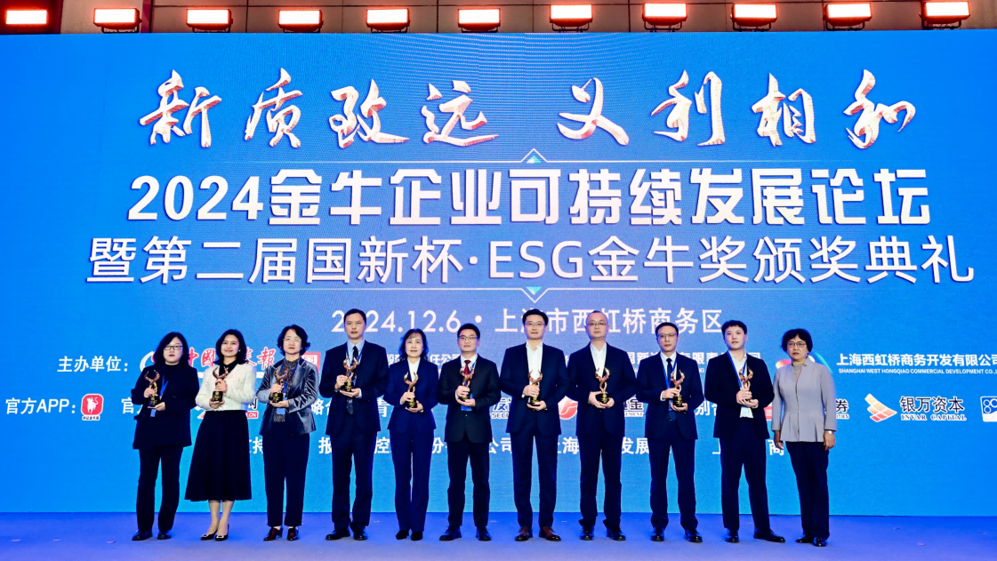 12月6日,由中國(guó)中證報(bào)和中國(guó)國(guó)新控股有限責(zé)任公司聯(lián)合主辦的“2024金牛企業(yè)可持續(xù)發(fā)展論壇暨第二屆國(guó)新杯ESG金牛獎(jiǎng)?lì)C獎(jiǎng)典禮”在上海青浦區(qū)舉辦。公司副總經(jīng)理、董事會(huì)秘書、總法律顧問郝家華受邀參加本次論壇。中節(jié)能環(huán)境2024年精心編制并首次公開披露的ESG報(bào)告,在本次論壇中喜獲國(guó)新杯“ESG金牛獎(jiǎng)新銳二十強(qiáng)”榮譽(yù)稱號(hào)。