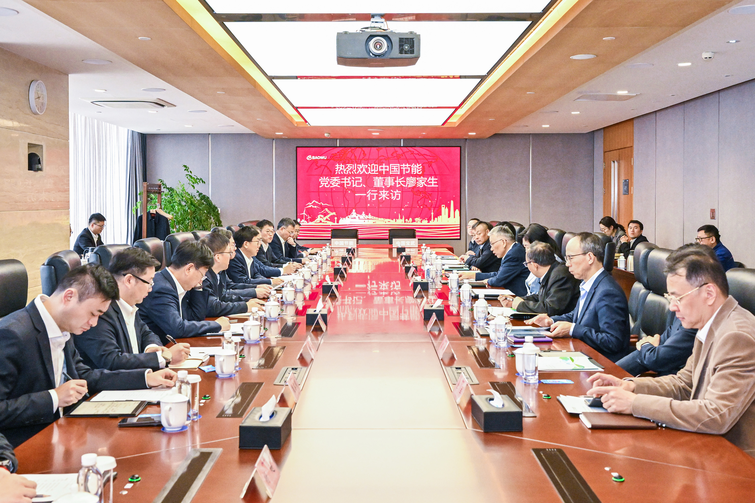 侯安貴對(duì)廖家生一行的到訪表示熱烈歡迎,并介紹了中國寶武的發(fā)展歷程和業(yè)務(wù)體系。他指出,作為全球最大鋼鐵企業(yè)之一,中國寶武以“共建鋼鐵生態(tài)圈,共創(chuàng)綠色新未來”為使命,始終將綠色低碳轉(zhuǎn)型作為實(shí)現(xiàn)高質(zhì)量發(fā)展的必由之路,與中國節(jié)能既有很好的合作基礎(chǔ),也有很大的合作空間。中國寶武期待將產(chǎn)業(yè)場景優(yōu)勢與中國節(jié)能的專業(yè)技術(shù)優(yōu)勢深度融合,在智慧水務(wù)、固廢資源化、鋼鐵余熱利用、綠電直連、碳認(rèn)證碳交易、綠色賬戶建設(shè)等方面進(jìn)一步加強(qiáng)合作,攜手打造央企間協(xié)同發(fā)展和綠色轉(zhuǎn)型的典范。 集團(tuán)總經(jīng)濟(jì)師兼大數(shù)據(jù)公司黨委書記、董事長鄭朝暉,集團(tuán)董事會(huì)秘書兼合作部主任趙友民,戰(zhàn)略部、節(jié)能科技公司、風(fēng)電公司、中節(jié)能實(shí)業(yè)、中國啟源、中節(jié)能國禎等單位負(fù)責(zé)人;中國寶武資源與新材料業(yè)發(fā)展部、智慧服務(wù)業(yè)發(fā)展部、戰(zhàn)略規(guī)劃部、寶武環(huán)科、寶武水務(wù)、寶地資產(chǎn)、寶武清能、歐冶云商、中鋼國際等單位負(fù)責(zé)人參加上述活動(dòng)。