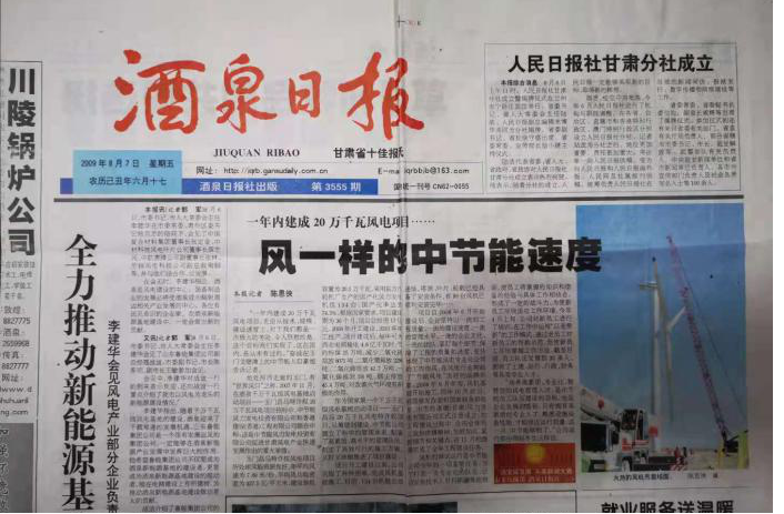 2009年12月25日,國家千萬千瓦級風(fēng)電基地裝機(jī)突破200萬千瓦調(diào)試并網(wǎng)發(fā)電儀式在中國節(jié)能玉門昌馬風(fēng)電場隆重舉行。時(shí)任甘肅省委書記陸浩、省長徐守盛和中國節(jié)能黨委書記陳津恩參加啟動(dòng)儀式。中國節(jié)能承擔(dān)的國家千萬千瓦風(fēng)電基地啟動(dòng)項(xiàng)目的重任向國家交出了滿意的答卷,被媒體譽(yù)為“風(fēng)一樣的中節(jié)能速度”“大漠戈壁的格桑花”。