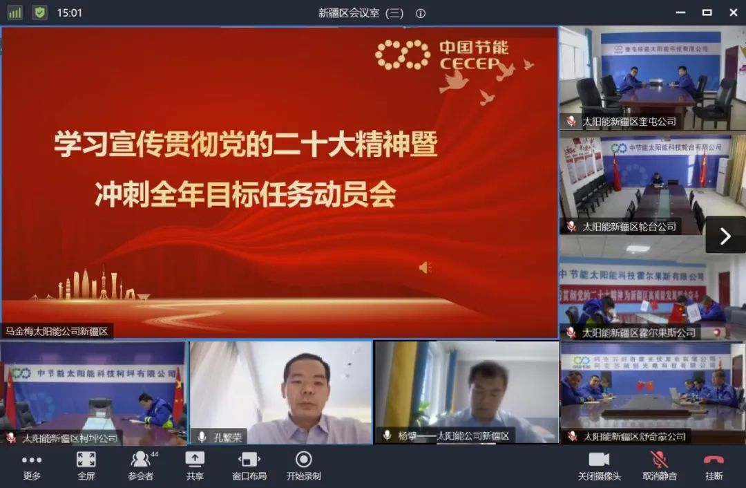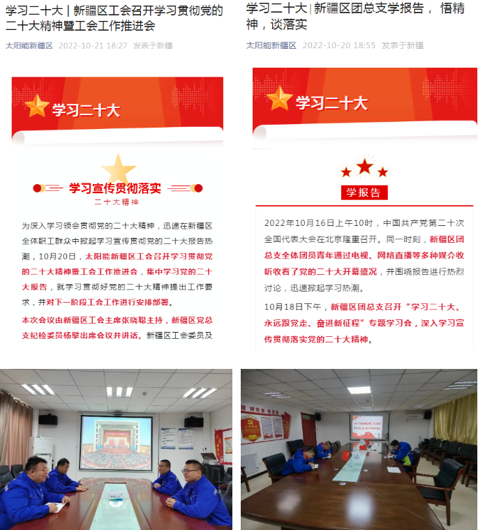 新疆區(qū)黨總支堅(jiān)決做到高起點(diǎn)謀劃、高質(zhì)量推進(jìn)、高標(biāo)準(zhǔn)貫徹,認(rèn)真落實(shí)歸口意識,對照集團(tuán)公司、太陽能公司黨委深入學(xué)習(xí)宣傳貫徹黨的二十大精神方案要求,依托愛黨愛國愛企學(xué)習(xí)教育活動,開展“貫徹黨的二十大·閱享新征程”、“禮贊新時(shí)代·奮進(jìn)新征程”、“我和家人一起感悟二十大”、“二十大快問快答”“我把黨的二十大講給你聽”“曬曬二十大學(xué)習(xí)筆記”等系列活動,切實(shí)把學(xué)習(xí)宣傳貫徹黨的二十大精神和“科技創(chuàng)新年”、推動“三新兩保一推進(jìn)”目標(biāo)任務(wù)結(jié)合起來,忠實(shí)踐行讓天更藍(lán),讓水更清,讓世界更美好的愿景,全方位、多角度地展示大區(qū)工作成效,以防風(fēng)險(xiǎn)、保安全、護(hù)穩(wěn)定、促發(fā)展的新成效為中國式現(xiàn)代化建設(shè)貢獻(xiàn)力量。