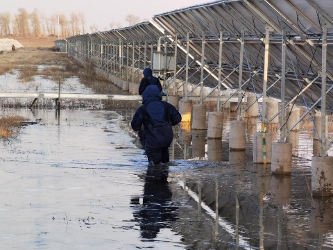 項目并網(wǎng)以后往往得花更多的時間去維護(hù)發(fā)電設(shè)施,這就要求運維人員將已經(jīng)損壞的設(shè)備替換下來,以保證整個系統(tǒng)的正常運行。自8月份以來,突如其來的三場臺風(fēng)給設(shè)備安全穩(wěn)定運行帶來嚴(yán)峻考驗。進(jìn)入電站的必經(jīng)之路已被大水淹沒,根本看不到路在哪里,所見之處,都是積水,多處道路已變成深水區(qū),運維人員沒有退縮,“沒有路也要創(chuàng)造路,就算蹚也得把設(shè)備送進(jìn)去”。于是,運維人員便經(jīng)過深水區(qū)運送設(shè)備,濕透半截的褲管是不懼臺風(fēng)影響最好的證明。地面積水嚴(yán)重,而光伏組件高度大多超過3米,被水浸泡過的地面無法固定絕緣梯,這給運維人員維護(hù)發(fā)電設(shè)備制造了嚴(yán)重障礙,檢修設(shè)備難度大大增加,但這依然阻擋不了運維人員進(jìn)行設(shè)備運維的決心。面對地面無法固定梯子的困境,運維人員紛紛化身“智多星”,群策群力,出謀劃策,最后決定在絕緣梯頂端加裝掛鉤,再用頂端的掛鉤懸掛在光伏支架上進(jìn)行維護(hù),解決運維難題。 氣溫驟降,寒風(fēng)颯颯;不懼嚴(yán)寒,站好每一班崗。 由于太陽能華北區(qū)吉林片區(qū)地理位置特殊,常年伴有天氣轉(zhuǎn)涼的跡象,在寒冷的天氣下工作已經(jīng)是運維人員的工作常態(tài),但是在零下30-40度的嚴(yán)寒氣溫下進(jìn)行設(shè)備巡檢工作,還是給運維人員帶來了極大的挑戰(zhàn)。在巡檢現(xiàn)場,經(jīng)常可以看到扶在設(shè)備上面的手凍得通紅,已經(jīng)變得僵硬。嚴(yán)重的時候甚至很難進(jìn)行正常的維護(hù)工作,回暖也需要好一陣子。可是時間就是發(fā)電量,設(shè)備提前一分鐘維護(hù)好,我們就多發(fā)一度電。光伏廠區(qū)嚴(yán)禁煙火,于是運維人員只能用體溫取暖的方式,將自己的手揣在衣服里貼著皮膚來進(jìn)行緩解,只有這樣才能既保證安全,又能將設(shè)備檢修故障盡快完成。 并網(wǎng)在即,關(guān)卡重重;盡心盡力,發(fā)揮最大的價值。