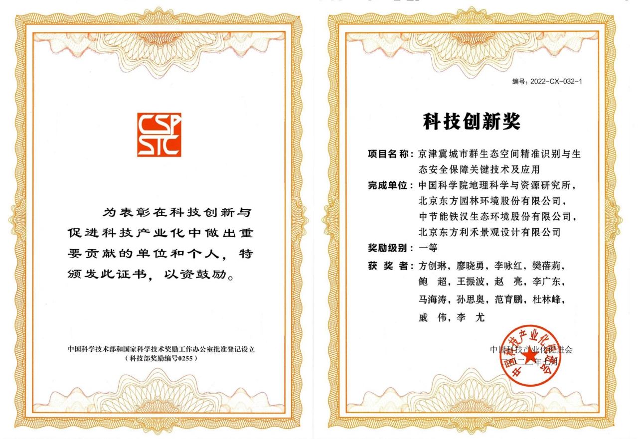 日前,中國(guó)科技產(chǎn)業(yè)化促進(jìn)會(huì)正式頒發(fā)2022年度科技創(chuàng)新獎(jiǎng)獲獎(jiǎng)證書(shū),由中節(jié)能鐵漢、中國(guó)科學(xué)院地理科學(xué)與資源研究所等單位聯(lián)合申報(bào)的《京津冀城市群生態(tài)空間精準(zhǔn)識(shí)別與生態(tài)安全保障技術(shù)及應(yīng)用》項(xiàng)目,榮獲2022年度科技創(chuàng)新一等獎(jiǎng)。