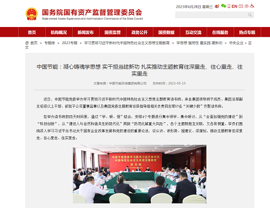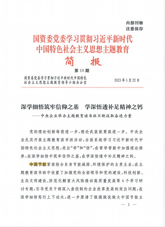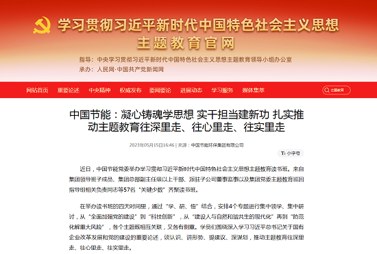 學(xué)習(xí)貫徹習(xí)近平新時代中國特色社會主義思想主題教育開展以來,中國節(jié)能深入學(xué)習(xí)領(lǐng)會習(xí)近平總書記重要講話精神,聚焦主題教育總要求和目標(biāo)任務(wù),堅持把主題教育同做強主責(zé)主業(yè)、建設(shè)人與自然和諧共生的中國式現(xiàn)代化緊密結(jié)合、一體謀劃,以強化理論學(xué)習(xí)指導(dǎo)發(fā)展實踐,以深化調(diào)查研究推動解決發(fā)展難題,高質(zhì)量開展主題教育,為企業(yè)發(fā)展凝心聚力。