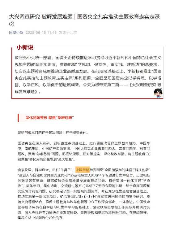 為將主題教育學(xué)習(xí)成果切實轉(zhuǎn)化為干事創(chuàng)業(yè)的生動實踐和顯著成效,中國節(jié)能黨委深入開展調(diào)查研究,各級領(lǐng)導(dǎo)干部深入基層、沉到一線,圍繞科技創(chuàng)新、市場開拓、安全環(huán)保等開展多層次、多方位、多渠道的調(diào)查研究,堅持把情況摸清、把問題找準(zhǔn),將“問題清單”變?yōu)樽陨淼摹奥穆毲鍐巍保袑嵃颜{(diào)研成果轉(zhuǎn)化為解決問題、推動發(fā)展的實際成效。